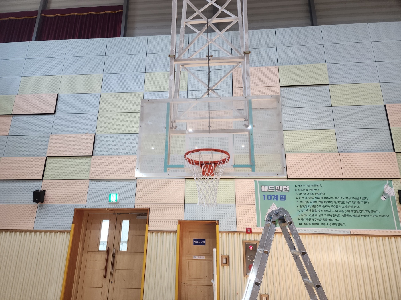 평택송탄초교 농구대 백보드 하단보호대 교체 작업 사진 입니다